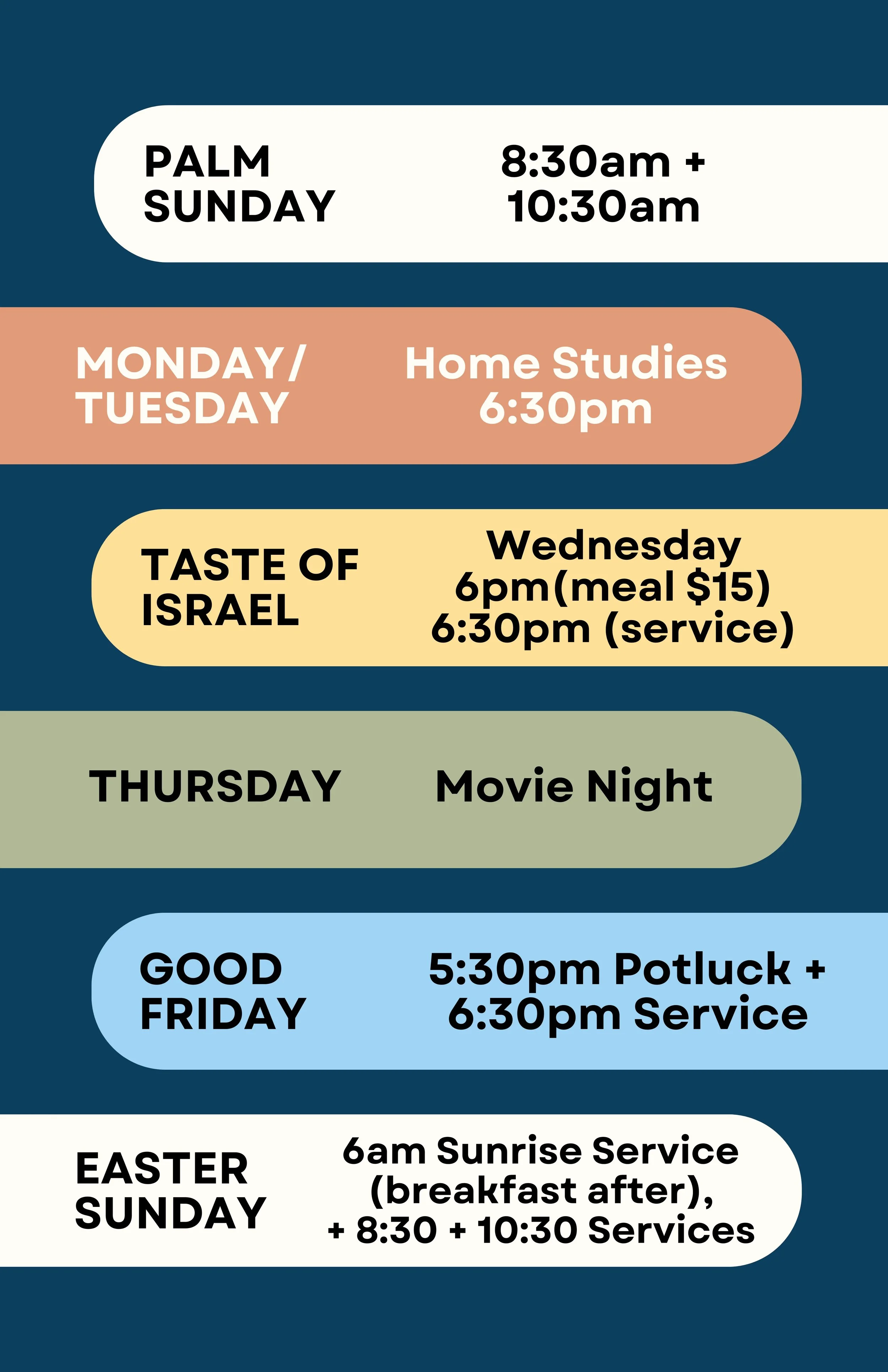 Each day we focus on what happened on that day 2,000 years ago. We either have a service at church, or gather together in local homes. Come join us and celebrate all that our Lord has done for us!